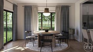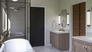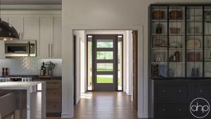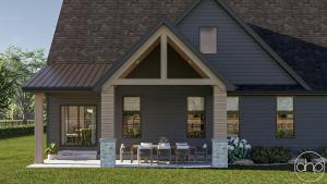 Designed with enduring materials and clean lines, the exterior blends board-and-batten siding, stucco, rich wood, and stone accents for a balanced and inviting façade. A steeply gabled roofline and metal-accented porch roof combine modern and farmhouse detailing. Generous, strategically placed windows frame views and allow abundant daylight while supporting the home’s strong connection to outdoor living.
